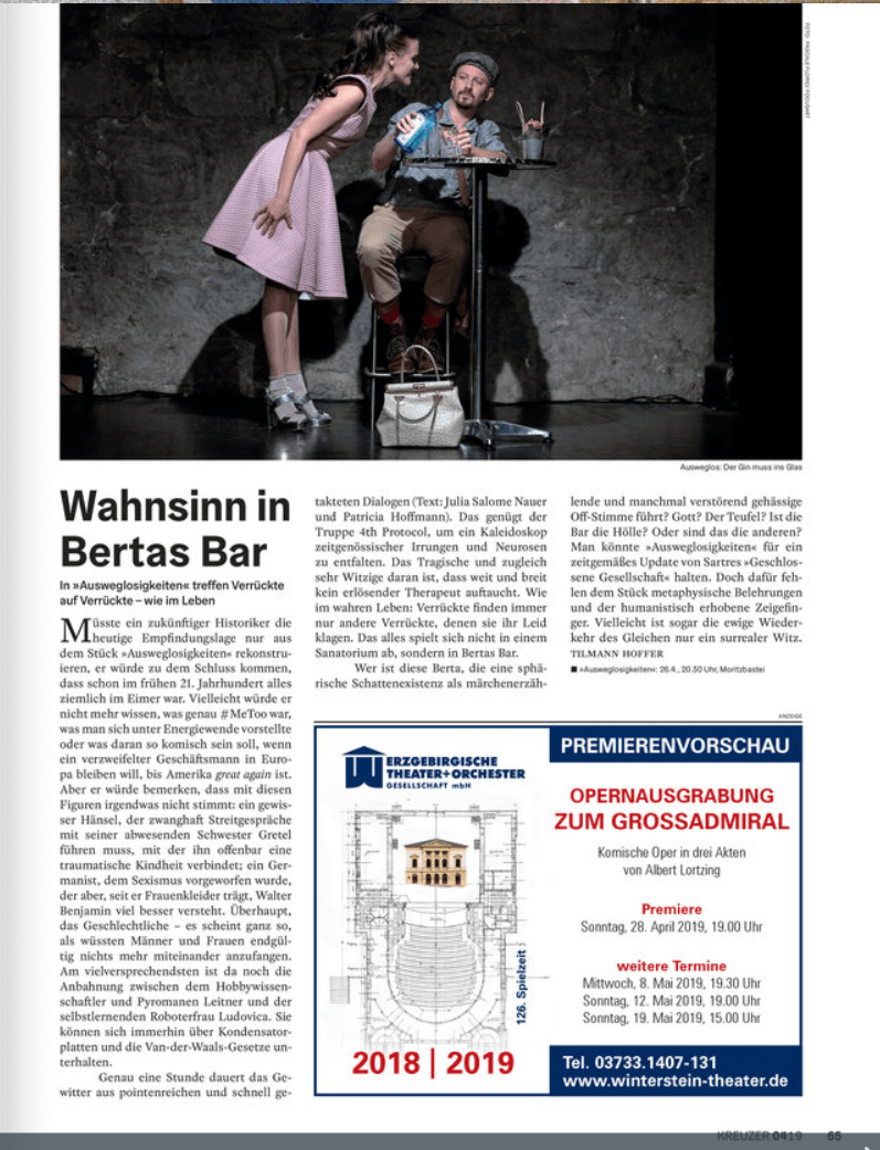 Tilmann Hoffer bespricht das Stück im Kreuzer Leipzig (April 2019):